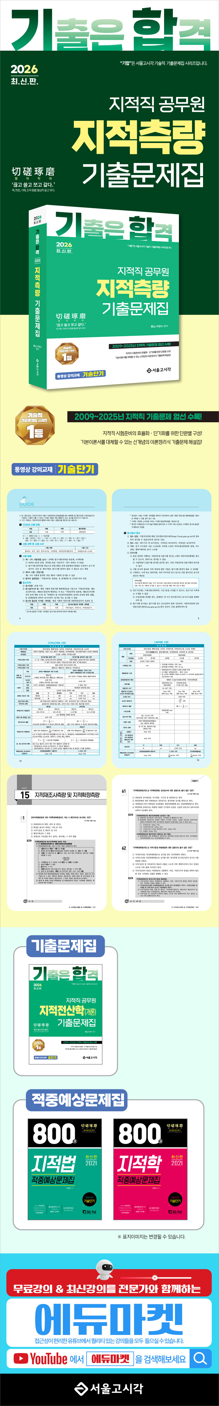 Home>출간도서 7.9급공무원 2026 기합 지적직 지적측량 기출문제집 확대보기 정가: 39,000원 저자: 이영수 출판사: 서울고시각 출판일: 2026.01.10 페이지: 828 page ISBN: 978895265163113530 구매하러가기 교재 구매 방법 교재 및 강의는 에듀마켓에서 구매하세요. 에듀마켓은 서울고시각의 강의특화사이트로 서울고시각과 같은강의 및 교재를서비스하고 있습니다. 에듀마켓회원만의 특별한 혜택 * 구매금액 불문 배송비 무료 * 모바일 강의 무료제공 (기기에 따라 재생되지 않을 수 있음) * 구매금액의 5% 적립 * 그 외 다양한 이벤트로 사은품과 혜택 제공 교재상세 이미지 교재상세안내 교재내용 및 특징 1. 단원별 기출문제를 수록하여 문제의 출제 경향 분석뿐만 아니라 출제 빈도 및 난이도를 수험생들이 쉽게 파악할 수 있도록 하였습니다. 2. 오랜 기간 지적실무 분야에 종사하면서 얻은 실무 지식과 다년간 강의 경험을 바탕으로 한 상세한 해설로 수험생들의 이해를 돕고자 노력하였습니다. 3. 다양한 기출문제를 수록하여 지적측량의 심도 있는 학습에 도움을 주고자 하였습니다. 차 례 PART 01 측량의 기초 PART 02 오차론 PART 03 거리측량 PART 04 각측량 PART 05 지적측량 PART 06 지적삼각측량 PART 07 지적삼각보조측량 PART 08 지적도근측량 PART 09 지적세부측량 PART 10 면적측정 PART 11 지적제도(도곽선 구획) PART 12 평판측량 PART 13 사진측량 PART 14 GNSS PART 15 지적재조사측량 및 지적확정측량 PART 16 지적측량 시행규칙 및 드론지적측량규정 PART 17 지적재조사에 관한 특별법 PART 18 지적재조사행정시스템 운영규정, 지적재조사업무규정 및 책임수행기관운영규정 PART 19 지적공부 세계측지계 변환규정 PART 20 지적업무처리규정 PART 21 지형 및 수준측량 이미지 확대보기