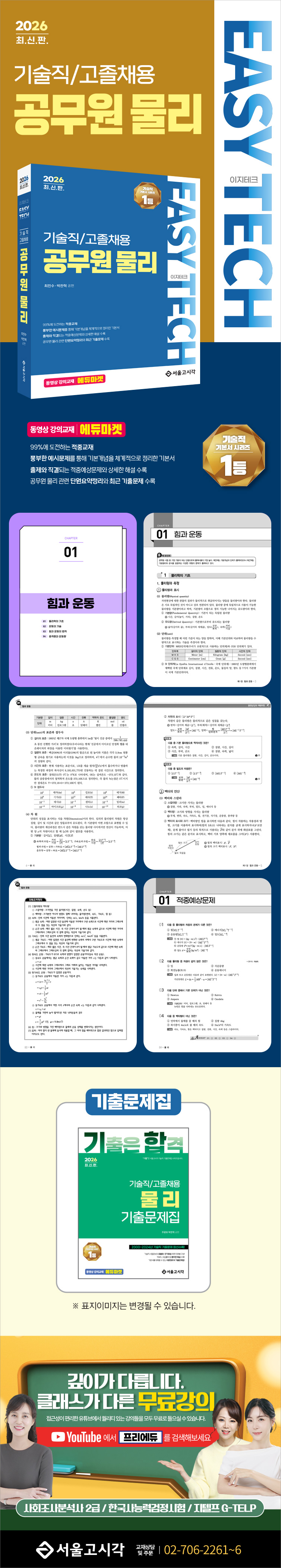 Home>출간도서 2026 EASY TECH 기술직/고졸채용 공무원 물리 확대보기 정가: 33,000원 저자: 최진수,박찬혁 출판사: 서울고시각 출판일: 2026.01.10 페이지: 612 page ISBN: 978895265147113420 구매하러가기 교재 구매 방법 교재 및 강의는 에듀마켓에서 구매하세요. 에듀마켓은 서울고시각의 강의특화사이트로 서울고시각과 같은강의 및 교재를서비스하고 있습니다. 에듀마켓회원만의 특별한 혜택 * 구매금액 불문 배송비 무료 * 모바일 강의 무료제공 (기기에 따라 재생되지 않을 수 있음) * 구매금액의 5% 적립 * 그 외 다양한 이벤트로 사은품과 혜택 제공 교재상세 이미지 교재상세안내 교재내용 및 특징 1. 물리에서 필수적으로 알아야 할 핵심 이론을 위주로 이해하기 쉽고 자세하게 정리하였으며, 그림과 그래프 등을 활용하여 효과적인 학습방법을 제시하였습니다. 2. 각 단원의 마지막 부분에는 단원요약정리를 넣어서 공부한 내용을 한 번 더 확인할 수 있도록 하였습니다. 3. 최신 기출문제와 그에 따른 해설을 수록하여 출제경향을 파악할 수 있도록 하였고, 본서로 공부한 내용을 실제 문제에 적용하여 시험에 대한 자신감을 가질 수 있도록 하였습니다. 차 례 CHAPTER 01. 힘과 운동 제 1 절 물리학의 기초 제 2 절 운동의 기술 제 3 절 힘과 운동의 법칙 제 4 절 충격량과 운동량 적중예상문제 CHAPTER 02. 에너지와 열 제 1 절 일과 에너지 제 2 절 열현상과 분자운동 적중예상문제 CHAPTER 03. 전자기 제 1 절 전기장과 전류 제 2 절 자기장과 전자기 유도 제 3 절 교류와 전자기파 적중예상문제 CHAPTER 04. 파동과 빛 제 1 절 파동 제 2 절 빛 적중예상문제 CHAPTER 05. 현대물리 제 1 절 빛의 이중성과 원자의 구조 제 2 절 원자핵과 기본 입자 적중예상문제 부록. 최근 기출문제 ∙ 2024.11.2. 지방직 고졸경채 9급 물리 ∙ 2025.6.28. 해양경찰 일반직 9급 물리 ∙ 정답 및 해설 이미지 확대보기