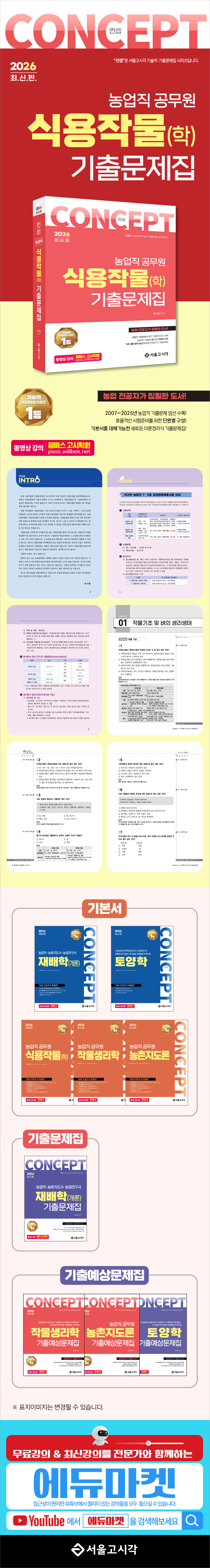 컨셉 식용작물학 기출문제집에 수록된 순서대로 반복되는 기출문제를 접하다 보면 어떤 영역에서 어떤 유형으로 출제되는지를 머리뿐만 아니라, 몸으로 느낄 수 있도록 구성하였습니다.